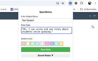 SpeedNotesは、Canvas SpeedGraderを使用する教育者のためにノート作成プロセスを効率化するように設計されたChrome拡張機能です。このツールは、教師が学生に関するノートを迅速に保存および管理できるようにし、採点中に簡単にアクセスできるようにします。学生の名前の自動入力やシンプルなインターフェースなどの機能を備えたSpeedNotesは、関連するノートをすぐに利用できるようにすることで、採点の効率を向上させます。